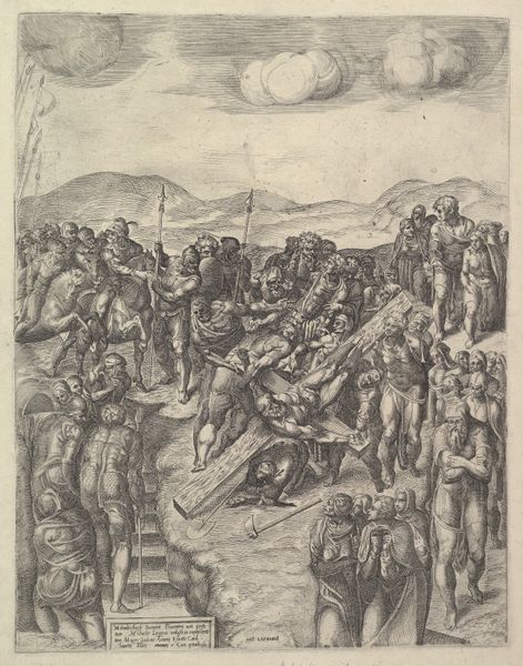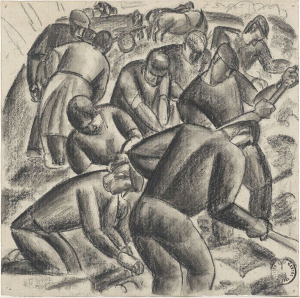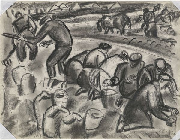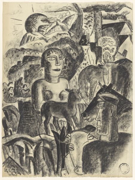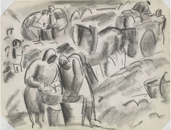 Curator: This pencil drawing, "Grazende koeien, boeren en arbeiders op het land," which translates to "Grazing Cows, Farmers and Laborers in the Field," was created in 1927 by Leo Gestel and resides here at the Rijksmuseum. It's an intriguing glimpse into rural life from nearly a century ago. Editor: It immediately strikes me as a depiction of social structure, almost theatrical in its arrangement. The looming figures in the foreground feel like they are presenting the workers and the land behind them. Curator: Gestel was certainly engaging with the socio-political realities of the time. In the early 20th century, rapid industrialization impacted traditional agrarian societies, a tension Gestel explores by juxtaposing stylized, almost monumental figures with working class figures further back. Consider how the angular depiction and placement of the laborers suggests alienation even while being active in the scene. Editor: The cows, too, their posture... they seem burdened. Livestock in art is frequently deployed as symbolic representations of wealth and labor. Here the muted tones, their heads bowed in almost desperate grazing – it suggests a fragility and hardship attached to these people and animals bound to the land. Do you see symbolic meaning invested in the clothing of the figures closest to us, as well? Curator: Absolutely. The distinctive headwear worn by the front-most figures connects them specifically to rural communities and a regional Dutch identity at a time of changing agricultural policies. It's not just about documenting a scene; it's a deliberate articulation of cultural markers that define this rural identity in opposition to dominant urban cultures. Gestel wants to assert a narrative for this time, which we understand through identity, labor, and, if we dig a little deeper, the politics embedded in the relationship. Editor: It's almost like the artist is posing a question to us today. Do we recognize what is taking place in a specific culture? Are these struggles truly past us, or simply transformed? Thanks to the symbolic richness found here, we are still challenged to reframe these social stratifications with the work we see around us, or risk forgetting important truths. Curator: Gestel's drawing becomes a touchstone for examining issues of social justice and collective memory. It invites us to consider what progress actually looks like when considered in conjunction with its effects. Editor: And with its careful arrangement of symbolic elements, Gestel evokes our responsibility as an audience in perpetuating such conditions through indifference. It leaves an echo in one's mind.