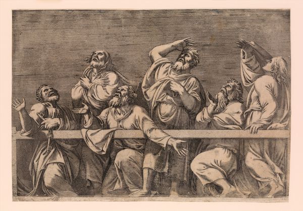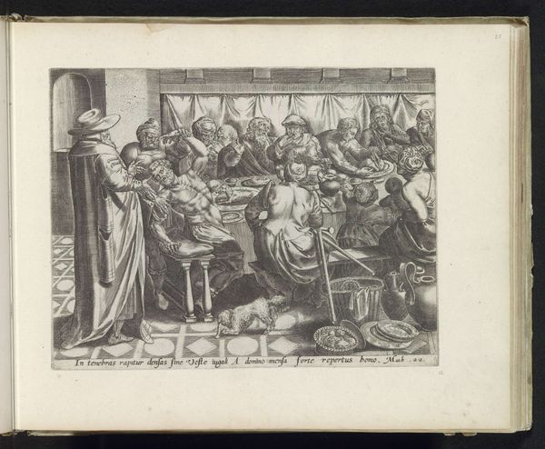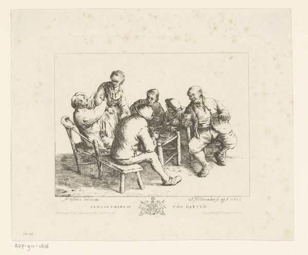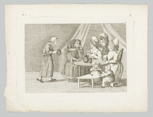 Curator: This etching, likely made between 1788 and 1806, is titled "Waardin is kwaad om de puinhoop van haar gasten"—"The Landlady is angry about the mess of her guests." It's by Friedrich Rottmann. Editor: Chaos! That's the overwhelming first impression. The tipped table, scattered objects... it all radiates disarray. It feels like a moment frozen in time, right before the eruption. Curator: The interesting thing to me is the medium itself, this print, probably made using a copper plate. Look at the way the ink sits on the paper. It's an intimate medium, meant for circulation, for the rapid dispersal of images. It makes you consider, who was the intended audience and where might they have viewed this image of bourgeois life gone awry? Editor: Ah, good point. And the central figure—that enraged landlady! Her stance, those arms spread wide. To me, it recalls images of divine wrath, think of depictions of angry deities from that era. Rottmann's connecting everyday frustrations with something larger. Curator: Indeed, though I'd wager the material reality is more pressing here. The cost of broken furniture, spilled drinks—who will foot the bill? These seemingly insignificant disruptions highlight deeper tensions around ownership and responsibility. Was Rottmann commenting on social mobility, showing what could happen when those unaccustomed to privilege are let loose? Editor: Maybe, or perhaps this chaos itself carries a moral message, echoing "vanitas" themes with its subtle memento mori that wealth is fleeting, and that everything collapses, or shatters? Those upturned table with dishes are common symbols, no? Curator: It does remind us that even the most carefully constructed systems are liable to break. Thinking about the artist's studio then, Rottmann as maker is complicit to a consumer society hungry for these sorts of depictions. What did prints mean as objects of economic trade themselves? It feels so much is contained within these material traces. Editor: Absolutely! And while Friedrich Rottmann created the plate and pulled the print, there were draftsmen, laborers involved in this artwork, creating both a physical object and an image. I'm fascinated how symbols resonate and refract, connecting viewers across different eras. Curator: Considering the context of production shifts our perspectives, doesn't it? It's more than just artistic representation; it’s about the complex dance of labor and resources. Editor: Exactly! That's been my enduring thought throughout the experience of focusing on the visual cues within this small printed snapshot from the late 1700s or early 1800s. Thank you for offering a material grounding for this conversation.
