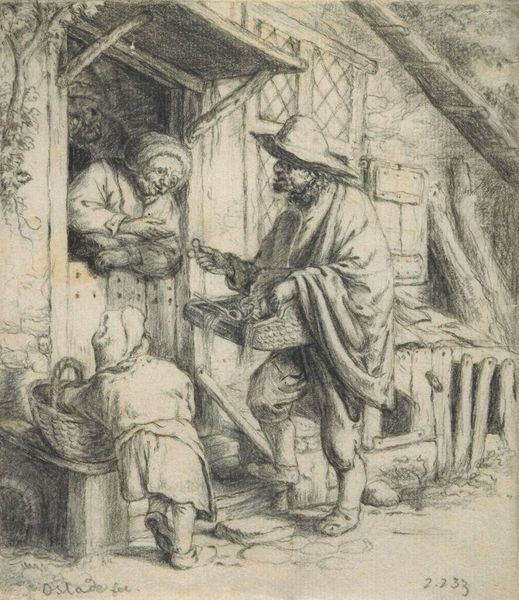 Editor: Here we have Rembrandt van Rijn's etching, "Travelling Musicians." It's quite small, and the figures are rendered with such fine lines. What can you tell us about Rembrandt's process here? Curator: Notice the layered etching lines, almost a feverish activity. Rembrandt, ever the businessman, used etching to disseminate his artistry. It democratized art-making, allowing for multiples and broader consumption. The plate itself becomes a site of production and labor. Editor: So, the value isn't just in the image, but in the means of its creation and distribution? Curator: Precisely. Think about the social context: how does the availability of prints impact the art market and Rembrandt's own agency as an artist? Editor: I hadn’t considered that! Thanks, that gives me a lot to think about.