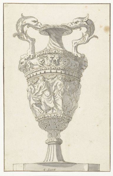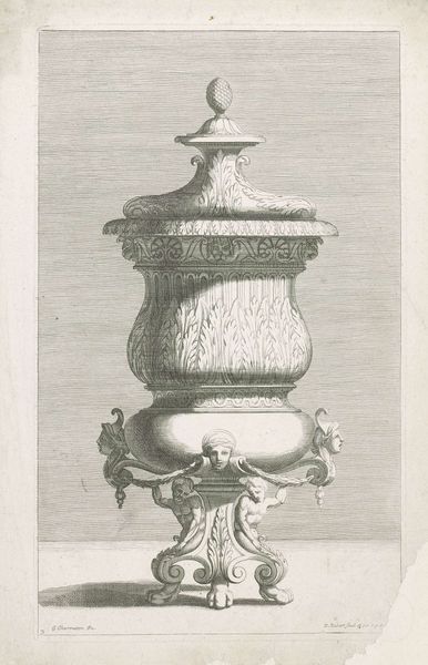 Nicolas Robert made this etching of a vase with a lid on a piece of stone in the 17th century. Robert, who served as a painter for the King, also produced a number of botanical illustrations. This print offers insight into the aesthetic values of the French aristocracy, who would have possessed such an object. The vase is adorned with garlands, leaves, and most strikingly, cherubic faces that lend the piece a sense of liveliness. These faces, reminiscent of ancient Greek and Roman sculpture, were highly prized in the royal courts and aristocratic residences of seventeenth-century Europe. Does the vase and its various ornaments evoke any thoughts or feelings within you? How might the original owner have felt about possessing such a precious item? This etching allows us to explore themes of wealth and luxury, as well as the role art plays in defining societal identity.