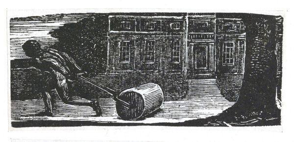 Curator: This intriguing wood engraving is titled ‘A Rolling Stone is ever Bare of Moss’ by William Blake. Editor: Immediately, I’m struck by the contrast. The intense, almost frantic energy of the figure against the static, imposing facade of the building. Curator: Indeed. Consider Blake’s process, the labor involved in carving this design into wood, mirroring the figure’s own toil. Editor: And the proverb itself, rendered visually, suggests a deeper reading: the rolling stone, free of moss, perhaps signifies a life unburdened by societal expectations. The house looming behind...that’s established wealth and fixed identity. Curator: The rawness of the engraving, its stark black and white, underscores the social commentary. Blake was deeply critical of the inequalities of his time. Editor: Yes, and look at the tree on the right. Its presence suggests a connection to nature, in contrast to the rigid architecture. It is as if Blake wanted to show us what is really important: freedom. Curator: A potent statement, even now. Thanks for pointing out the tree. Editor: It makes you wonder: are we the rolling stone or the moss?