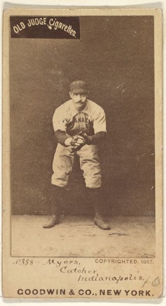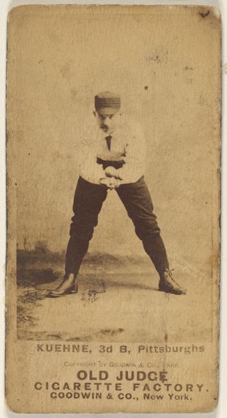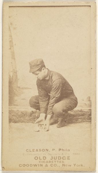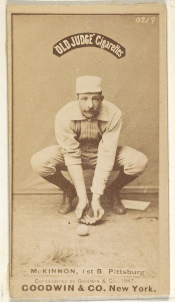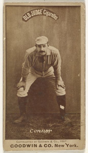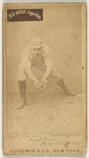 Editor: This is a baseball card from 1887, featuring Samuel "Sam" Newhall Crane, a second baseman for the Washington Nationals. It’s part of the "Old Judge" series by Goodwin & Company, promoting their cigarettes. What strikes me is how posed and formal it feels for a sporting image, like a studio portrait. What’s your take on this, coming from that era? Curator: It's a fascinating artifact, isn't it? To me, it's a window into a bygone era, when photography was still a relatively new medium. Consider the card's purpose. Yes, it promoted cigarettes. And baseball’s growing popularity, intertwined! See the sepia tones; there is an appealing vintage warmth here. Baseballers became almost mythical. They didn’t just depict reality; they were selling aspiration and escapism. Do you find a story unfolding within that sepia tint? Editor: I never thought about the aspirational angle. I guess I just saw a static image, but you're right; it's a snapshot of a cultural moment and it brings back so many forgotten memories. The vintage effect helps enhance its nostalgia feel! How do you think people perceived these images back then? Were they as captivated as we are looking back? Curator: I think so, or even more! The power of visual media was perhaps greater then, precisely because of its novelty. Each image, printed by innovative techniques on card stock, had an allure now diminished. But looking at Crane's focused stance, his grip on the ball, doesn't it suggest a yearning for a simpler time, of tobacco-filled stadiums, hard fought battles and a hero for everybody to admire? The baseball players back then have the same popularity as today's rockstars! Editor: Wow, you've given me so much to think about. The aspirational element, the cultural context, and how revolutionary these images would have been. Curator: Exactly. Art is about perception, so go and try looking at these with the lens of a contemporary person! It becomes an extraordinary tale about art and dreams, that's what art truly means!