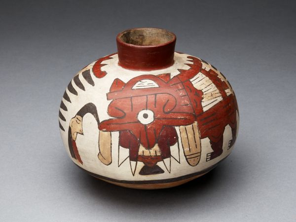 This earthenware jar, made by the Nazca people, features a costumed ritual performer holding plants. The vessel was created through pinching and coiling. The clay, likely sourced locally, would have been carefully prepared, mixed with water and kneaded to remove air pockets. Once the clay was formed, it was painted using mineral-based pigments to create a striking visual narrative. This decoration is carefully considered, depicting a figure in ceremonial garb, a scene that speaks to the spiritual beliefs and social practices of the Nazca people. The act of creating this vessel, from the gathering of raw materials to the skilled painting of its surface, was undoubtedly a labor-intensive process. This jar exemplifies how materials and making are deeply intertwined with cultural meaning. It also challenges our conventional art history categories: is this fine art or craft? Perhaps the more relevant question is, what does it tell us about the world in which it was made?