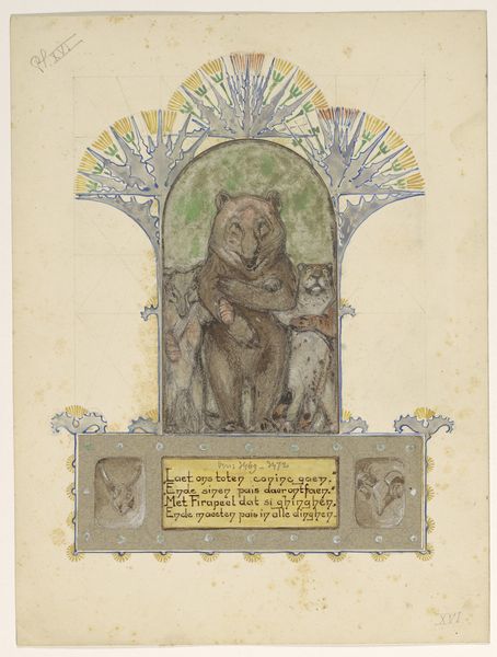 Curator: Right now, we’re looking at “Reinaert Speaks to King Nobel and the Assembled Animals” by Bernard Willem Wierink, created sometime between 1866 and 1939. It's currently housed in the Rijksmuseum. Editor: Oh, immediately it has this wonderful storybook feel! The watercolor and colored pencil work give it such a soft, almost dreamlike quality. I'm drawn to the kind, yet weary lion figure—he looks like he has heard it all before. Curator: The choice of watercolor and colored pencil is quite interesting, especially given the narrative element. It does soften what can be, at its core, a very pointed social satire in the original "Reynard the Fox" tales. Editor: Satire yes, but isn’t there always that question of who truly holds the power and by what methods, even in something that looks delicate like this? Look at how these techniques almost 'elevate' a subject matter typically resigned to folk traditions or simple illustrations. Curator: Exactly. The artistic choices here invite us to consider the construction of the fable itself—the labour involved in creating such a detailed composition highlights the labor that also went into the distribution of such tales during the Medieval Era. Editor: True. And notice the faux-Medieval frame around it, further blurring the line between object, artifact, and purely narrative device. It's almost like peering into a stage play from another world, full of intrigue. I'm wondering if it challenges notions of "high" and "low" art as it seems like there’s a wink happening at all times. Curator: That's right. Wierink invites a critical reassessment of the very stories that make up our cultural memory. What’s consumption here? How much is craft? Editor: And just consider the lifespan of a narrative. The way Wierink revisited this medieval fable so much later suggests storytelling is never a simple process. Curator: Indeed. Each stroke, each shade carefully applied, makes us reconsider what is timeless and what simply echoes. Editor: So it seems we're not just appreciating a piece of art, but we're participating in the enduring performance of its narrative, questioning its context as it questions ours.