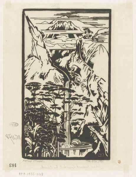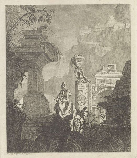 Curator: At first glance, the intricate details give me a sense of grandeur and melancholy. What do you make of it? Editor: This is “Landschap met ruïnes en groteske vaas,” or “Landscape with Ruins and Grotesque Vase,” a print made by Jean Laurent Legeay sometime between 1767 and 1770. Legeay was a significant figure in the late Rococo and early Neoclassical movements, heavily influencing French architecture and design. Curator: Ruinscapes like this often invoke complex narratives. The vase, an object of immense cultural value, stands among remnants of past glory, and seems to dominate the natural world, as if claiming dominance. Editor: Absolutely. The vase itself acts as a potent symbol of history and enduring power, even amidst decay. Its presence invites reflections on how civilizations rise and fall. What stories and values have been lost? Who benefits from this revision of historical memory? The positioning also hints at an inherent imbalance in whose culture remains and whose fades from prominence. Curator: And note the people in the lower left! They look so small in comparison to the vast structures and the vase itself, seemingly dwarfed not just by their surroundings but also by time. Perhaps the print implies their powerlessness within a much grander sweep of historical events? Editor: Precisely. The juxtaposition invites questions about human agency within monumental shifts and historical power dynamics. The choice to render it in print, readily reproducible and accessible, implicates how meaning can proliferate with cultural significance. It highlights accessibility to broader society while solidifying Legeay's impact. Curator: Considering its themes, it's tempting to interpret it as a reflection on 18th-century French society. With its deep contrasts, it suggests to me that Legeay wanted us to examine power and permanence and, perhaps more crucially, how they are always negotiated in any social environment. Editor: I agree. The enduring power of symbolism certainly ensures that art keeps pressing and prodding across historical changes. Curator: It all seems quite relevant, considering contemporary struggles. Editor: Indeed, its beauty remains profoundly unsettling, prompting ongoing re-evaluation.
