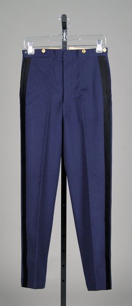Curator: Well, this is striking. It's simply a pair of black trousers, isn't it? Something very elegant and minimalist, at least at first glance. Editor: These trousers exude a particular aura, don't they? A silent promise of formal evenings, of unspoken social codes and hierarchies inherent in formal wear. It makes one ponder the cultural power of fashion, specifically that of the tuxedo, that is suggested in this image, designed by H. Reit in 1929. Curator: Absolutely, thinking about the social history gives an excellent approach to understand the deep meanings rooted in these trousers, particularly considering when these were made. If these were part of a smoking suit, then they were conceived during the roaring twenties, weren’t they? Think of jazz, flapper girls and prohibition era; everything marked by decadence, economic prosperity, intense social and cultural changes, not just fashion. Editor: I think so. Let's think about the context of this garment during the interwar years. It becomes clear that they symbolize a certain echelon of society, and particularly men, that not everybody could get, suggesting a reality deeply divided by gender roles, race and economic position, but also hinting on emancipation given their elegance and aesthetic value that somehow rejects tradition and embraces modernity. What's interesting is how fashion reflects power and privilege. Curator: Right, the garment becomes a form of visual language, instantly communicating status. You know, analyzing this pair of pants prompts several questions regarding clothing design through an intersectional lens. What about women challenging these rules in clothing, particularly in the roaring twenties? And what does it means considering their neutrality from our present gaze? Editor: Indeed, and photography as a medium helps, it presents the garment in isolation allowing us to reflect on those tensions. And what does it mean that someone decided to make this as a photographic portrait? Curator: To wrap up, I believe we agree that fashion items goes beyond materiality. Garments acquire symbolism charged of sociocultural meanings related to race, class, and gender. Editor: Absolutely. Fashion, presented here in an intimate close-up of a smoking trouser, acts as a social text, telling complex narratives if one just learns how to read them carefully, right?