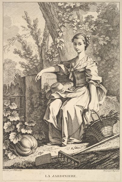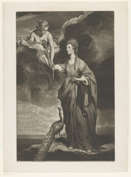 Editor: Here we have "Catherine, Lady Bampfylde," a print from 1779 after a drawing by Thomas Watson, now hanging at the Art Institute of Chicago. She’s posing so elegantly, it's all very graceful, almost dreamlike, and the setting behind her looks theatrical. What do you see in this portrait? Curator: The way Lady Bampfylde is staged within this artificial landscape speaks volumes about the social role of portraiture in the late 18th century. These weren't just likenesses, they were carefully constructed images meant to convey status, taste, and morality. Do you notice anything about her pose in relation to the setting? Editor: She’s kind of perched, isn’t she? Not really part of the landscape, almost like she’s placed there… Curator: Precisely! The pastoral setting, combined with her fashionable attire, creates a dialogue about nature versus culture, and, of course, wealth. What do you think about the contrast between her elaborate dress and the natural scene behind her? How does that reflect the values of the time? Editor: I guess it highlights the importance of appearance and status for women in that era, it's as if their social role defined even their connection to nature. It all feels performative. Curator: Absolutely. Prints like this one made such images widely accessible. This contributes to how such concepts were disseminated, shaping public perception and, indeed, reinforcing social hierarchies. Think of the museum itself as an extension of these display spaces and these social values. Editor: So the image and its circulation helped to perpetuate a specific vision of class and gender. I hadn't really thought about prints working like that before, how their distribution can influence ideas on such a large scale. Curator: Exactly, and it's crucial to understand these works not just as pretty pictures, but as active participants in cultural and political life. Editor: That gives me a lot to think about – it is not just about the sitter; the image, and its availability as a print is as important, if not more.