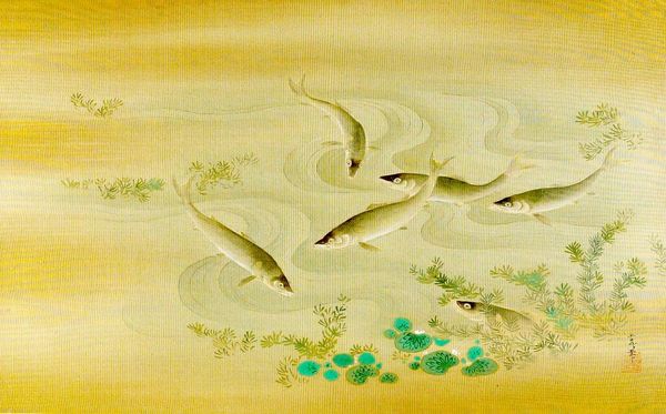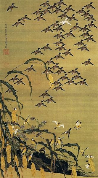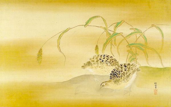 Curator: Kano Tsunenobu painted these "Two Snipes in a Stream," and it resides here at the Harvard Art Museums. Editor: It’s incredibly serene; the delicate brushstrokes make the snipes almost melt into the golden wash of the background. You can feel the quiet of the marsh. Curator: The composition definitely evokes a sense of stillness. Snipes often symbolize solitude and resourcefulness, so their presence here taps into deeper themes. Editor: I wonder about the paper itself – likely meticulously prepared with multiple layers. The artist's choice of materials is so deliberate, impacting the mood. Curator: Yes, the texture of the paper lends the painting an almost ethereal quality, furthering the idea of the snipes as symbols transcending the everyday. Editor: Thinking about the artist's labor, grinding pigments, applying washes – it's a form of meditative work that seeps into the image itself. Curator: Absolutely. And as we absorb the painting, it reminds us to look beneath the surface, beyond the image itself, toward inner meanings. Editor: Agreed. It is a lovely reminder of how much contemplation can be held in the simplest of forms.