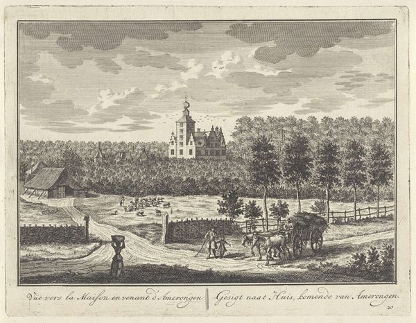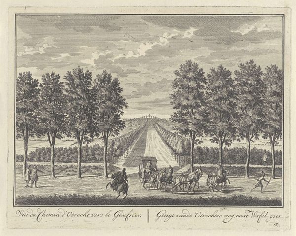 Daniël Stopendaal created this print of the 'Grote laan en poortgebouw bij Kasteel Zuilenstein' using etching. This artwork provides us with an insight into the lives of the elite during the Dutch Golden Age. The composition emphasizes the grandeur of the estate, but it is also a stage upon which we see figures of different social classes. The figures on horseback and in fine dress contrast sharply with those on foot, likely servants or laborers, highlighting the rigid social hierarchies of the time. In the 17th and 18th century, country estates were not just homes; they were symbols of power, wealth, and lineage. The meticulously designed landscapes, like the long avenue depicted here, were carefully constructed to project an image of control and order. As such, this etching is a document of the aesthetic and social values of the Dutch aristocracy, a group keen to display its dominance and cultivation. It serves as a reminder of the labor and social structures that supported this lifestyle.