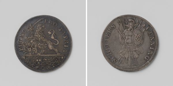 Editor: This metal relief, titled "Inname van de schans St. Andries door de troepen van Maurits, graaf van Nassau" from 1600, looks like an oversized coin. It feels quite symbolic, almost like a commemorative medal. What strikes you when you look at this? Curator: The first thing I notice is the labor. Consider the process of engraving, especially on metal. The skills needed, the time invested... it elevates this object beyond simple currency. This wasn't just for spending, it was for preserving power. Look at how the inscription circles the images on both sides, further enforcing this object as more of a declaration than an expense. Editor: So you see its value not in its monetary worth, but as a record of... of what exactly? Victory? Propaganda? Curator: Precisely! Victory, undoubtedly, but consider *who* is commissioning this piece. It’s a statement about control and material wealth converted into political and social currency. And the symbols! What’s being explicitly shown? How does the material itself reinforce that meaning? Editor: Well, the depiction of the fort being captured makes that literal. But the sun imagery and Latin inscription are harder to decode. It's like the metal itself gives weight to these ideas... a solid, lasting impression. Curator: Exactly. Think about the circulation of these objects, and how that movement influences public opinion and constructs historical narrative. We must also ask what it meant to be able to own a piece of political power through a precious material at that moment in time. What narratives get amplified, and at whose expense? Editor: I hadn't considered the way its materiality adds to the meaning. I guess it’s a lot more complex than just a picture on metal! Thank you. Curator: My pleasure. Always look to the materials – they whisper the true story.