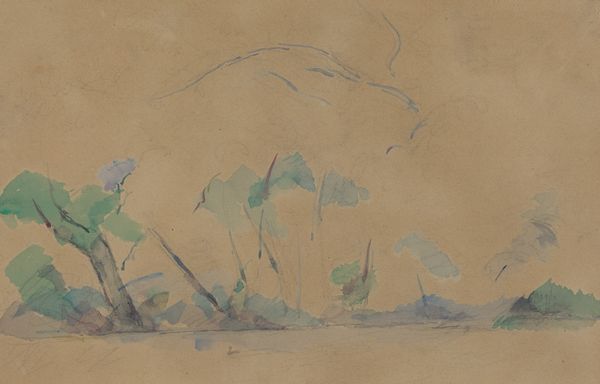 Curator: Munch's "Top Section of Decoration for Oslo City Hall," executed in oil paint between 1931 and 1933, presents us with a fascinating glimpse into his landscape work. Editor: Immediately, I'm struck by its seeming simplicity. The color palette is restrained, almost monochrome, which lends the sketch a kind of starkness. The visible brushstrokes give it an incredible sense of immediacy. Curator: It is interesting that you pick up on the palette and immediacy. These mural studies were part of a broader, ultimately unrealized, artistic initiative connected with Norwegian national identity and anxieties during the interwar period. Editor: I see, it's fascinating to think about the work existing between this nationalistic drive and the formal construction of shapes. Notice how Munch deploys the economy of line and colour here. He uses black and white for essential structural elements, while the background tone is integrated and gives form and depth through the very limited colour selection. What does this abstraction mean in this nationalistic context? Curator: This piece sits at the intersection of nationhood and individual expression, grappling with both cultural memory and political realities in that specific inter-war moment. I find this struggle mirrored in Munch's expressive lines, as you’ve described. His focus, though intensely personal, intersects with broader conversations of national identity. He used nature as a reflection of this national sentiment, focusing on how the landscape can hold collective memory and aspiration. Editor: It’s hard not to see this intersection expressed through the push and pull of stark form and loose gesture within the painting. It’s like he’s struggling between order and disorder. His focus on elemental forms speaks volumes. Curator: Yes, and recognizing that struggle – that unresolved tension between representation and abstraction, self and society – is crucial to understanding not only this sketch, but much of Munch's oeuvre. Editor: Indeed, exploring this interplay between formal structure and deeper cultural anxieties really enhances our viewing experience. Curator: Absolutely. It underscores the vital role art plays in processing and reflecting society.