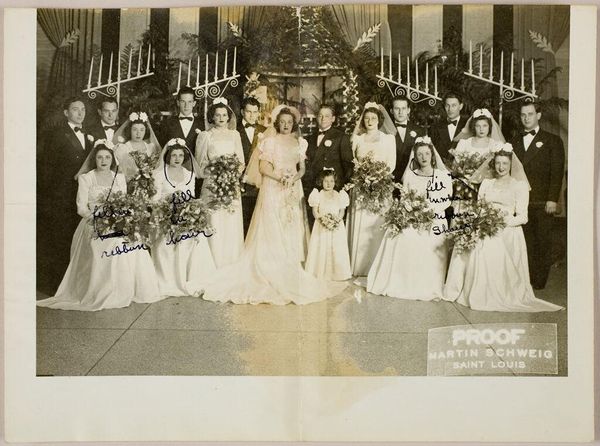 Curator: This photograph by Percy C. Byron, currently held at the Harvard Art Museums, shows a bride and her bridesmaids in New York. It’s an interesting document of the era, wouldn’t you agree? Editor: Oh, it's a sea of white! There's something about the uniformity that feels almost spectral, like a gathering of elegant ghosts. Curator: Indeed. Considering the social conventions of the time, the image reinforces the aesthetic of idealised femininity. It seems to reflect the pressures placed on women to conform to specific roles and appearances. Editor: It makes me think about the dreams we weave around weddings. Are they dreams of love, or are they dreams of societal approval? This image captures that tension so well. Curator: It’s a compelling point. The photograph acts as a mirror reflecting both the beauty and the constraints of its time. Editor: Exactly. Seeing this photograph feels like a little pause to ask some important questions.