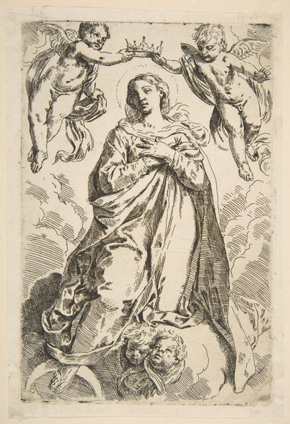 Editor: Here we have a print from sometime between 1651 and 1711 titled "H. Rosa in een lijst met bloemen." The texture seems very intricate, a tightly rendered engraving. How would you interpret this work through a formal lens? Curator: It is a fascinating example of Baroque printmaking. Note how the artist utilizes the contrast between the central figuration and the surrounding floral border. Observe the delicate linework employed to define forms and create depth. What is particularly striking is the way the composition directs the viewer’s gaze towards the central figures, Saint Rosa and the Christ Child, before expanding outward to appreciate the elaborate frame. Editor: The floral frame seems to compete a little with the central scene for my attention. Is that intentional, maybe a technique to elevate the status of the subject matter? Curator: Precisely! Consider the function of ornament in Baroque art. The ornate floral border is not merely decorative; it actively contributes to the overall symbolic program of the work, inviting us to contemplate the themes of divine grace and earthly beauty. How do you perceive the relationship between these visual elements? Editor: I see a mirroring, the roses within the frame reflecting Saint Rosa herself. It is a nice touch. The balance and symmetry create a harmony I missed on my first pass. Curator: Indeed. And let us not overlook the technical virtuosity demonstrated in the engraving process itself, with its emphasis on meticulous detail and precise execution. Through this refined control of medium, the artist constructs a visual discourse on artifice and spirituality. I found it fascinating how an analysis of structure led us here! Editor: Absolutely. I am starting to see more layers within the same image. Thanks for helping me appreciate how details shape understanding.