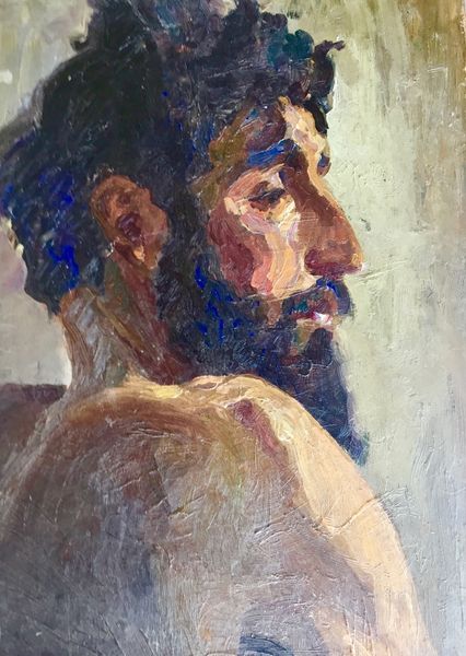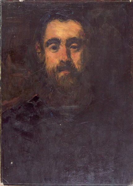 Curator: Here we have a piece titled "Portrait of a Man" by Ilya Repin. We don't have an exact date for its creation, unfortunately. Editor: The fellow looks flushed, doesn’t he? Almost like he's just finished telling a very long story, or maybe having a passionate argument. There's a certain intensity to his gaze, yet the soft color palette creates a dreamlike quality, don't you think? Curator: Absolutely. Notice the visible brushstrokes; they lend the work an immediacy, an unfinished quality perhaps indicative of its function as a study or sketch. This style aligns with aspects of realism. The materials, the impasto oil paint layered thick to create texture, offer significant insights into Repin’s technique. Editor: Texture is key! You can almost feel the stubble on his chin, which I like, as opposed to all that stiffly posed portraiture from ages ago. He looks alive, real…tired. It also evokes that raw romanticism from, say, Géricault, but with less drama and more just a regular-bloke vibe. It's approachable, do you see? Curator: Precisely. It’s compelling how Repin uses the impasto not just for texture but to capture the light. The luminosity gives the portrait a remarkable presence. From a production standpoint, considering the availability of oil paints during Repin's time, we might ponder his access to quality materials and its reflection in his oeuvre, though documentation around the piece itself is rare. Editor: Access certainly does influence creativity. The composition is relatively straightforward, yet there’s an underlying narrative at work. I want to *know* this person's story! What has made him weary, yet willing to engage the viewer directly? You can tell, this wasn’t some commission from some royal. This man has lived. Curator: An astute observation, considering social portraiture’s functions back in the time it was produced. Editor: Well, now I'm off on another journey into imagination. Thank you, Ilya. You created something beautiful. Curator: Indeed. And a demonstration of Repin's enduring artistry.