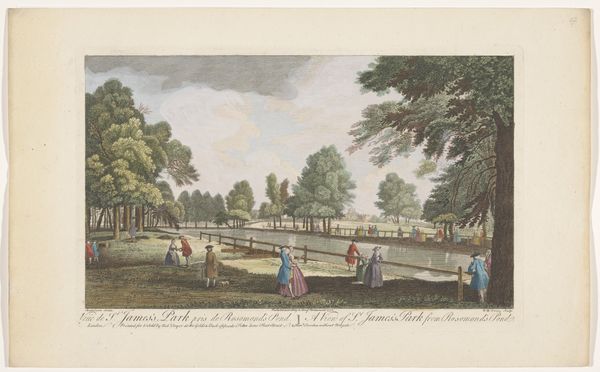 Editor: Here we have Robert Sayer's "View of the Rotunda in Ranelagh Gardens, London," possibly from 1751, a print with watercolor. The scene feels so mannered and staged. What can we unpack from this snapshot of 18th-century London? Curator: This image, beyond its Rococo style and picturesque landscape, offers a glimpse into the construction of public space and its social hierarchies. Who is depicted here, and perhaps more importantly, who is *not*? Editor: Well, everyone seems rather well-to-do. It's a fashionable crowd, all gathered in this garden. Curator: Exactly. Ranelagh Gardens was a space of leisure and display primarily accessible to the upper classes. These gardens became sites where social performances were enacted, solidifying existing class structures through carefully managed visibility and exclusion. The Rotunda itself was a stage for such performances. Consider how this image might also participate in a system of visibility, creating an idyllic representation while subtly masking other realities. What stories remain untold? Editor: You're right. I was caught up in the pretty scene and missed that this image normalizes and even celebrates a very specific segment of society. So, in a way, this piece acts as a tool to legitimize the wealthy's place. Curator: Precisely. By visually reinforcing the status quo, art can subtly shape our perceptions and perpetuate inequalities. Thinking critically about the representation and absence becomes, therefore, an act of resistance. Editor: That really changes how I see the image. Thanks, I’ve got a lot to ponder! Curator: My pleasure! It’s about asking: who benefits from this particular story?