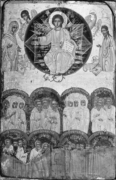 This icon, "Bogoliubskaya Mother of God with the Chosen Saints," was crafted by an anonymous artist, and you can view it here at the Metropolitan Museum of Art. Immediately, the composition strikes you with its intricate detail and the way the figures are rendered in relief, creating a tactile quality. The artist skillfully uses the metallic medium to reflect light, adding depth to the scene. The icon's structural arrangement divides the space into distinct zones, each populated with figures who are both individualized and unified through their shared devotion. Lines and curves define the drapery and halos, directing our gaze across the surface. This elaborate detail invites a semiotic reading, where each element functions as a sign within a larger cultural and religious code. The metallic surface enhances the icon's symbolic power, acting as a mirror reflecting divine light and reinforcing the spiritual significance.