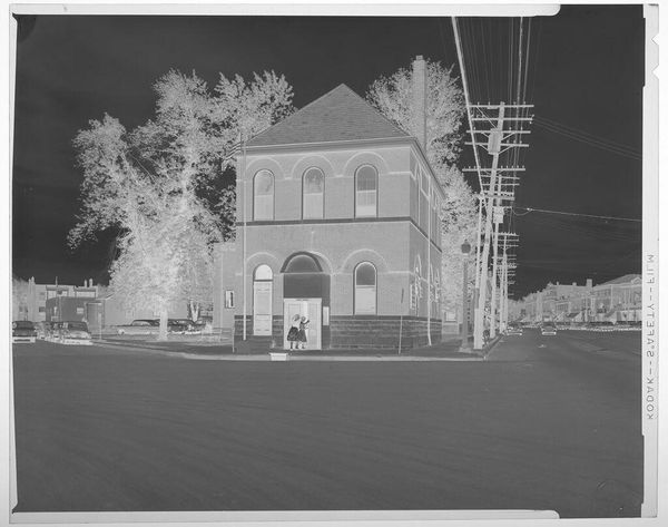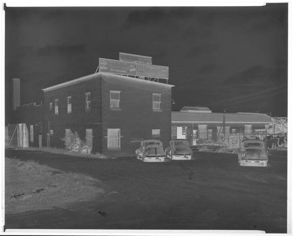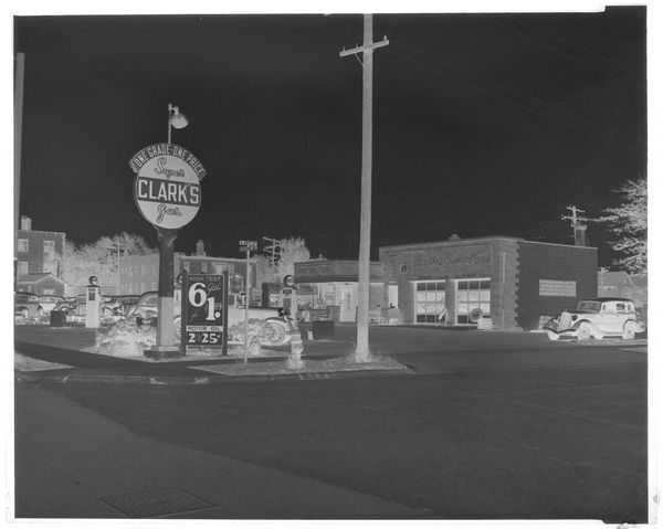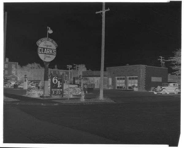 Editor: So, this is an untitled photograph by Hamblin Studio, showing Lee's Esso Grill. It feels a bit like stepping into a time capsule, a strangely peaceful one at that. What strikes you about it? Curator: It's funny, isn't it? The mundane elevated. This image, for me, whispers of simpler times, those small-town American dreams fueled by cheap gas and diner coffee. The negative print intensifies the stillness, but I see the promise of the open road, don't you think? It practically begs us to invent a story for it. Editor: The stillness definitely gets to me. Thanks!
