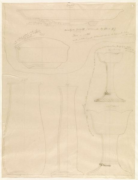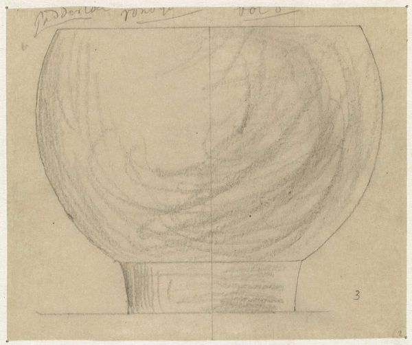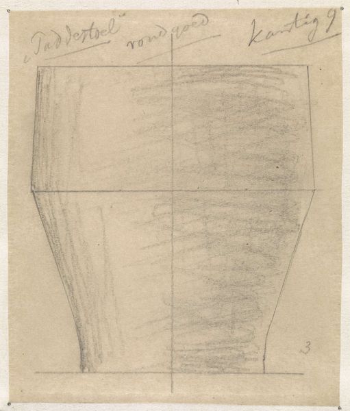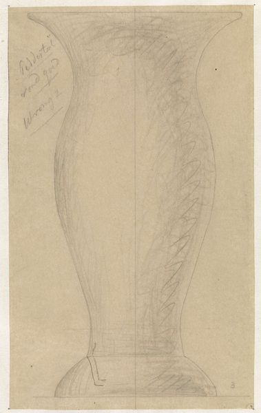 Theo Colenbrander designed this vase using graphite on paper, which presents us with an intricate exploration of form and function. The drawing captures a tall vase, bisected by a central line. This vertical division accentuates the vase's symmetry and guides our eye along its graceful curves. The vase swells and narrows, echoing a play of opposing forces. These rounded shapes, rendered with subtle shading, suggest a three-dimensionality that belies the flat surface of the paper. We can consider this in the context of semiotics where the vase form, traditionally associated with containment and display, here becomes a study in pure, abstract form. The addition of lines and annotations suggest Colenbrander's engagement with the modernist ethos. The drawing’s power lies in its capacity to transform the utilitarian into the aesthetic, inviting viewers to reconsider the relationship between art, design, and the everyday object.