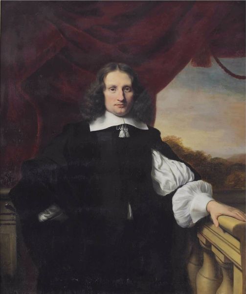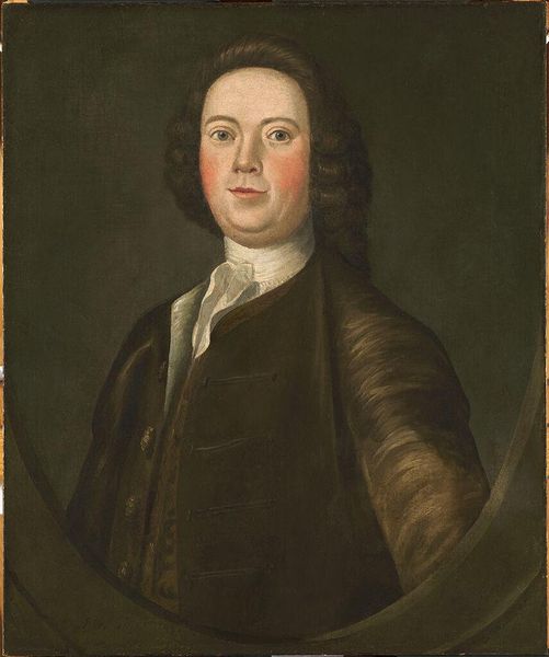 Curator: Here we see Robert Feke’s portrait of Benjamin Franklin, painted in oil on canvas. It measures about 127 by 102 centimeters, and it resides here at the Harvard Art Museums. Editor: My first impression is one of restrained ambition. The color palette is rather muted, giving the subject a grounded feel against the expansive landscape. Curator: Indeed. This was painted early in Franklin's career. Look at the sartorial choices and the somewhat generic landscape; it situates him within a context of colonial aspirations and identity formation. Editor: And the landscape itself suggests possibility, doesn’t it? Openness, potential. Combined with the almost legalistic black coat and curled wig, he's signaling his participation in a particular social order. Curator: I think you're right. He's using the visual language available to him, but he’s also subtly bending it to his own narrative, foreshadowing his rise. Editor: It’s a fascinating dialogue between the man and the symbols of his time. Curator: Absolutely, a moment captured right before he redefined those symbols.
