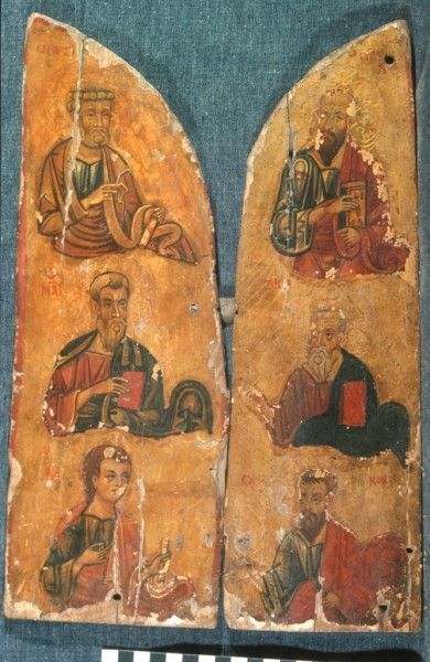 Curator: At first glance, I see solemnity and...durability? There’s something incredibly grounding about this piece, even before considering its age. The gazes are direct, the palette muted yet rich. It feels like witnessing figures preserved not just in pigment, but in time itself. Editor: Exactly! We’re looking at a tempera on wood panel icon dating back to 1125, titled "Apostle Philip with Saint Theodore and Saint Demetrius." It resides in the Hermitage, and it's a fascinating example of Byzantine art, its style emphasizing spiritual symbolism. Curator: It's striking how the figures seem to float against that gold, or perhaps ochre, ground. Do you notice how their halos act like miniature suns, each radiating its own gentle, almost internal light? It is quite fascinating to see so many saints here depicted together like old friends or close colleagues at a board meeting. Editor: That use of halos is characteristic, drawing on a well-established visual language of sanctity and divinity. Their frontal poses invite direct engagement from the viewer, fostering a personal connection. They’re windows into a realm beyond our everyday experiences. Look how Theodore and Demetrius, in their military attire, flank Philip, showcasing a divine army, if you will. The spear and shield are their attributes of holy soldiers of the divine army. Curator: An interesting touch that they don't directly interact. Philip has some kind of folded paper scroll? The stories these figures tell individually is what adds to their collective impact on me. Even without the historical or religious context, their conviction resonates profoundly. Each expression holds a silent narrative that tugs at something ancient inside me. Editor: The scroll is what is associated with Apostle Philip and designates him within the holy cohort depicted here, of course. Iconography is powerful precisely because it transmits these narratives, beliefs, and values across centuries. The piece as a whole isn’t just about these three specific figures. It reminds the viewer about the whole universe and where one should align their beliefs with divine virtues. Curator: I always find it interesting when different interpretations lead to some creative discussion... For me, though, art hits home when the emotional connection hits first... Editor: It all hits on a level, indeed... And for the visual historian and everyone, a wealth of hidden truths are hidden behind these holy personages. It shows continuity, as well.