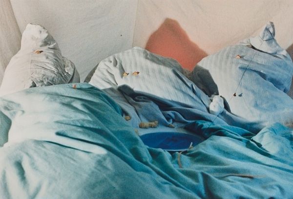 Curator: Jim Goldberg captured this scene, "Freckie, Heather, and Chance, Sunnyside Hotel," back in 1989, using gelatin silver print to freeze this particular moment in time. Editor: It feels instantly melancholic to me, this gray-scale starkness contrasted with such intimate moments… There's an unsettling exposure of vulnerability here. Curator: Vulnerability certainly. Goldberg's work often deals with the fringes of society, shining a light on stories we tend to overlook. The Rosary and band t-shirts feel loaded here in the composition, almost confrontational. Editor: Agreed. And thinking of production, the use of black and white intensifies the rawness. I imagine the photographer amidst the space— what does the act of photographing in this context even look like for the subjects of the photograph? Were these photographs produced on-site, given the immediate material circumstances portrayed here? Curator: The location and moment he has chosen speaks of impermanence, which may even lend to the reading of vulnerability. The subjects, Freckie, Heather, and Chance appear to grapple for affection amidst the chaos— an affection that exists at once, behind a sort of performative persona— an early Gen X love, maybe? Editor: Possibly. Consider the labor involved here, from Goldberg’s initial capture to the development of the print itself. These silver gelatin prints were often used because they could capture detail and tonal range. Are they supposed to communicate the idea that every feeling counts or every labor, perhaps? The photograph feels a bit staged... the labor is a bit suspect? Curator: It certainly plays with a staged sensibility, and that liminality gives the viewer a discomfort— how "authentic" is the artist being about his subjects? But it’s not unusual. The photograph reflects a deeper yearning. Despite the roughness of the surroundings, the symbols— like the rosary beads— still offer glimpses of enduring values that provide meaning even in transient conditions. Editor: Right. And while the composition highlights raw, interpersonal realities, the medium of photography is almost complicit in aestheticizing poverty… Curator: Indeed, the tension adds to the photograph’s strength, wouldn’t you agree? Editor: Certainly does. Food for thought— considering image, moment, subjects. Curator: The layers embedded offer reflections on the world around us all.