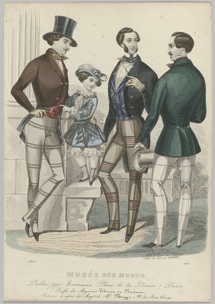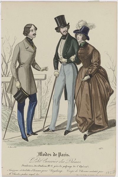 Curator: Let's turn our attention to "Le Follet, 1853, No. 1817 bis," a drawing in ink and watercolor on paper by an anonymous artist. What's your initial reaction? Editor: They strike me as… a bit puffed up, actually. The tight tailoring, the raised chins. This image fairly breathes the rising bourgeois ambition of the mid-19th century! Curator: The composition, too, lends itself to that reading. Note the crisp linearity of the figures and their clothing, set against the soft, indistinct backdrop of nature. This reinforces the figures' distinct separation from, almost dominance over, their environment. Editor: Absolutely! The attire itself speaks volumes. The leftmost figure’s plaid trousers, though fashionable, feel almost like a flamboyant challenge to established norms, don't they? He’s embracing the new wealth. Curator: I see the visual rhyme between the plaid of the trousers and the soft stippling used for the leaves behind them—the artist is visually yoking 'nature' to artifice. The figure on the right, however, is the picture of classic top-hatted respectability. Note his cane; its polished, gleaming finish signals status. Editor: A definite symbol of power and control, the cane transforms from a practical object into an emblem. Consider, too, the slight arch to his brow. The top hat becomes a kind of crown, signifying authority and belonging within a rigid social hierarchy. Curator: Precisely. The visual harmony of the three figures rests in their formal arrangement, however the differences, or perhaps aspirational aims of the figures, are all there to be decoded by a knowing beholder. Editor: This "knowing beholdier", that’s who "Le Follet" served. As a fashion plate, it disseminated visual information, instructing its readers on how to construct their own identities through clothing, while also commenting on social dynamics. Curator: A complex layering of surface and substance—revealing an underlying tension between individual expression and societal expectations, don't you agree? Editor: Indeed, a fashionable surface hiding so much more. Fascinating!