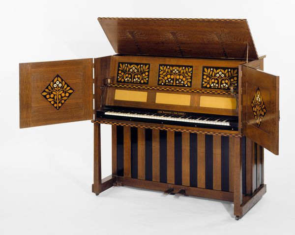 Curator: The Pianoforte, dating from 1800 to 1825 and crafted by George Gilfert, showcases a geometric yet decorative style from the neoclassical movement using primarily wood. What are your first impressions of the piece? Editor: The symmetry is so striking! The rectilinear form, from the body to the legs, it's all about straight lines. The decorative details provide the contrast. What strikes you about its formal qualities? Curator: Note how the inlaid geometric patterns interplay with the instrument’s primary function. The linear structure lends it a severe elegance, a sense of restrained power. Consider also how the horizontal emphasis counters the vertical thrust of its legs, grounding the entire object. How do these elements shape your understanding? Editor: I see what you mean. The lines give it presence. It's a visually grounded instrument. Curator: Exactly. Gilfert has essentially created a study in contrasts. Do you perceive a dialogue between line and embellishment? Editor: I do now, considering the geometric inlay contrasted with the delicate floral embellishments. Curator: Precisely! These juxtapositions guide our reading of the artwork. It shows restraint, with controlled ornamentation reinforcing its structural framework. Do you notice the play of light on its surfaces? Editor: Now that you mention it, I notice the rich wood grain is enhanced with light playing across the varnished surfaces. Curator: The luminosity enhances our interpretation of both the form and the material, underlining its artistry. Editor: That interplay wasn't immediately evident, but you've spotlighted the crucial features that I might have overlooked. Thank you. Curator: It is through considered observation of these aspects that a more comprehensive reading can be undertaken.