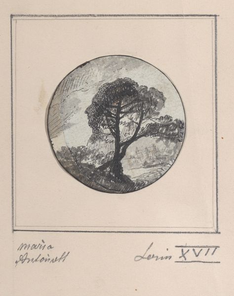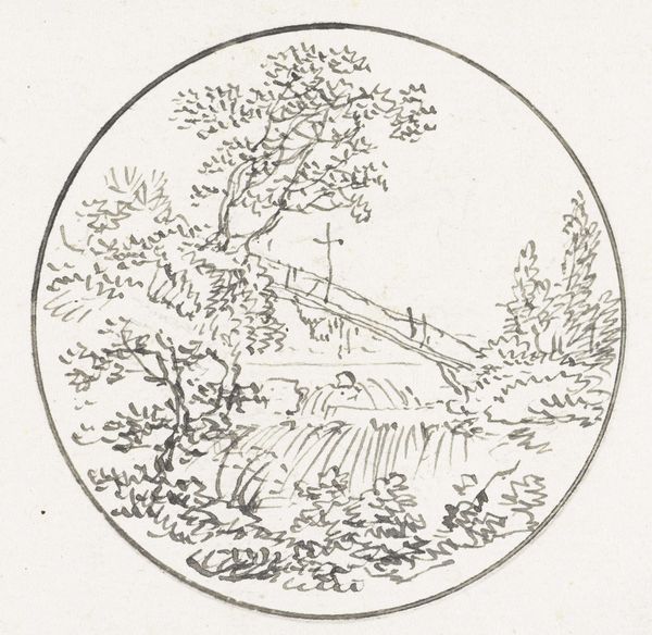 Giovanni Francesco Grimaldi made this drawing of a tree section by the water. The composition is striking, enclosed within a circle, where line work defines the form. Grimaldi skillfully uses hatching and cross-hatching to model the textures of bark and foliage. Notice how the trees create a dynamic play of diagonals and curves. The winding trunks and branches juxtapose the horizontal lines of the distant water and shoreline. This tension between the organic and the geometric is fascinating. The meticulous detail and formal arrangement reflect a baroque sensibility, emphasizing clarity and order even within a natural scene. This echoes a broader cultural interest in understanding and categorizing the natural world. We're invited to consider the role of art not just as representation but also as a framework for understanding and interpreting our environment. The circular frame contains a multitude of marks which don't just represent a natural scene but convey an idea of nature itself.