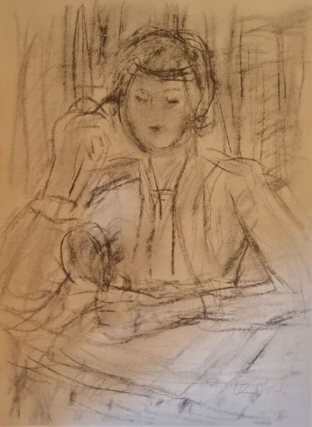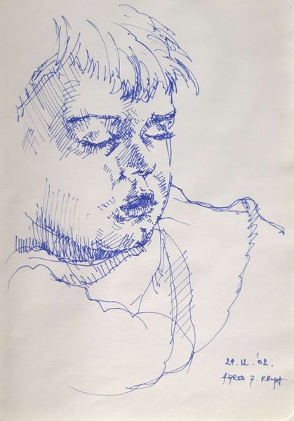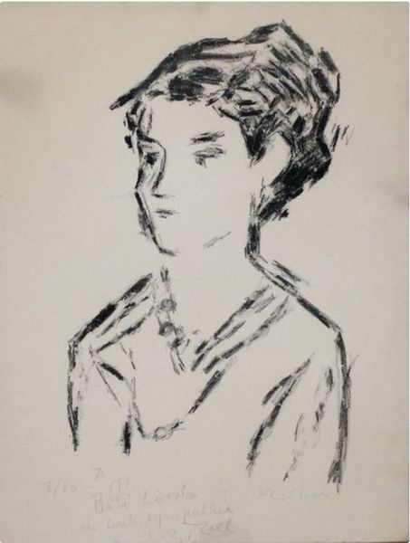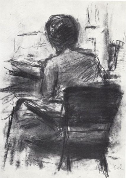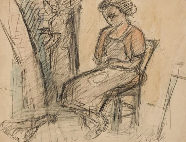 Curator: This is Bela Czobel's "Girl in Interior," a drawing made circa 1935. Editor: It’s striking how the charcoal and pencil lines capture such a quiet mood, almost somber. Curator: Yes, the piece evokes that sentiment, and Czobel, though somewhat removed from mainstream Parisian circles, actively engaged with Fauvist and Expressionist movements, evident in his use of expressive lines. These influences shaped the reception of his work within those circles. Editor: The composition feels both complete and incomplete. There's a clear focus on the figure, but the interior space dissolves into abstract lines. That contrast is what holds my attention. The lines really activate the visual field, even within this seemingly simple scene. Curator: Right, consider the broader context—portraits of women were not neutral, but laden with socio-cultural expectations, frequently conveying specific values or status. This seems like a somewhat private portrayal, compared to those more public, socially declarative pieces. Editor: Absolutely, you can see it in the formal choices—the sketchy nature almost seems like an attempt to peel back the sitter's facade. Is the relative incompleteness meant to enhance that effect? Curator: Perhaps. His biography informs much of how we view his subject choices. He did transition away from more overt political subjects later in his career. His work can prompt reflections on the evolving status of women in interwar Europe. Editor: What's compelling, in this instance, is how the lines create this air of melancholic contemplation, less defined by social role than a private state of mind. Curator: Agreed, this intimate work by Czobel prompts consideration of individual experiences within larger historical forces. Editor: A superb display of raw charcoal put to the task of something intensely emotional!