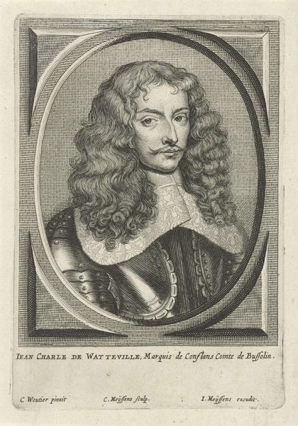 Curator: This engraving, now held at the Rijksmuseum, is titled "Portret van Eugène de Berghes" and dates to sometime between 1650 and 1670. Cornelis Meyssens created it using metal engraving techniques. Editor: There’s a severity to it. The crisp lines emphasize the weight of his armor, yet there’s a delicacy in the depiction of his flowing hair. It feels like a study in contrasts—strength and vulnerability, authority and accessibility. Curator: Yes, portraits of this era were often carefully constructed to convey specific messages about status and power. De Berghes, identified as the Comte de Grimberghe in the inscription, clearly wanted to project an image of strength through his armor and the controlled formality of the composition. Editor: It makes me consider who gets memorialized in this way. Power defines portraiture. Who gets left out of the frame? I immediately start wondering about the unnamed people who enabled De Berghes’s power – whose labor or even exploitation funded his lifestyle and this image? Curator: That's an important perspective to bring to any historical portrait. While the piece might seem like a straightforward representation of nobility, the social context adds layers of complexity. Meyssens was active in Antwerp during the mid-17th century and portrait engravings like these played a vital role in disseminating images of influential figures across Europe. These weren't just artworks, they were tools for building reputations and solidifying social hierarchies. Editor: And controlling the narrative. An engraving allows for reproducibility, creating multiple versions of a controlled image to solidify perception. The stern gaze, the polished armor– everything works to reinforce a desired narrative about this man and his place in society. Do you feel this resonates even today in terms of the types of public image people wish to craft about themselves? Curator: Certainly. Consider how political leaders use visual media even now to craft and control public perceptions. Editor: Looking at this engraving then prompts consideration of how portraiture perpetuates, disrupts or reinterprets established social power structures and the meaning they carry. Curator: Precisely. It is also fascinating to note the material limitations of the technique influencing the final result, but let's move along.