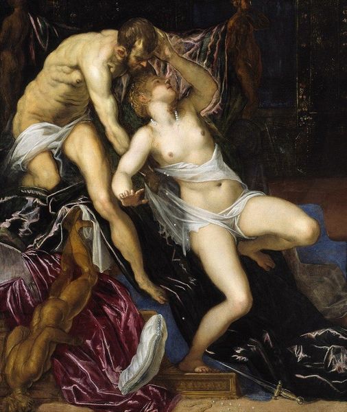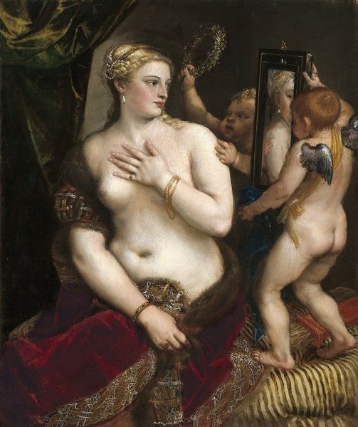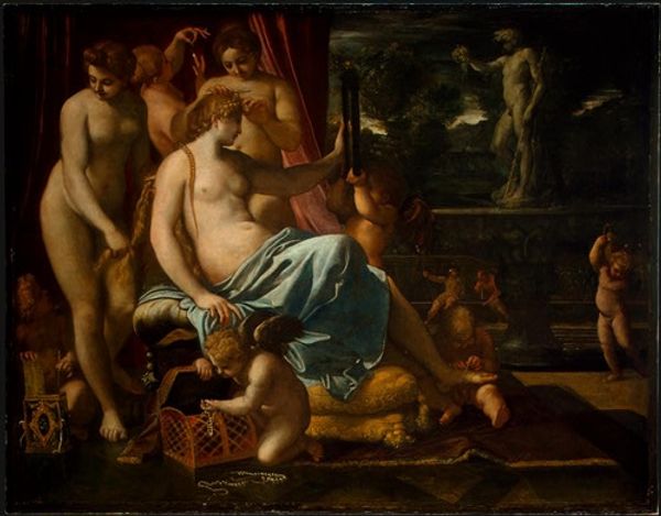 This painting by Bartholomeus Spranger depicts an episode from Homer's Odyssey, a story deeply embedded in the cultural and intellectual life of 16th-century Europe. Here we see the goddess Circe, an enchantress, and Odysseus, the Greek hero. The painting encapsulates the tension between power and vulnerability, a theme that resonates through both classical mythology and the social dynamics of Spranger's time. Odysseus, typically a figure of strength, appears here with his helmet raised as though in supplication or surprise, while the bare-backed Circe leans intimately to whisper into his ear. Her exposed body and commanding gesture offer a study in the complexities of female power, desire, and agency. While the male gaze is evident, Spranger subtly hints at the power dynamics at play, inviting us to consider how historical narratives are constructed through the lenses of gender, class, and identity.