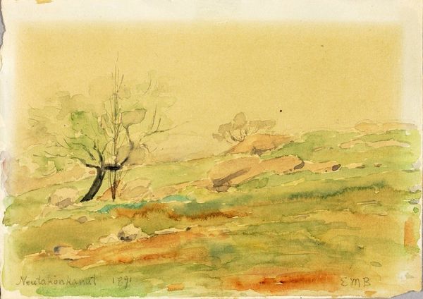 Curator: Let's examine "Pastures in Normandy" by Jean-François Millet. The watercolor and ink seem so casually applied, but look closer. Editor: It does appear to be a quick sketch. There’s a simple beauty to it, almost effortless. How would you interpret it? Curator: Notice the paper itself – the visible texture. And the almost crude application of watercolor; areas left deliberately unpainted. These weren't expensive materials. The "effortless" feel belies a canny awareness of artistic economies and their connection to Millet’s target audience. It challenges the grand landscapes favored by the academies, doesn't it? This appeals to the rising middle class and reflects changing artistic consumption, showing how art materials access has shifted within social hierarchies. Editor: So, you're saying the apparent simplicity reflects a larger shift in how art was being made and consumed? Curator: Precisely! Millet democratizes the landscape through his choice of material. How can such materials contribute to how we, as consumers, engage with and create landscapes within the artistic realm? Editor: I hadn't considered that before. Thinking about the labor of creating art like this… the accessibility of the materials changes everything. Curator: Exactly! And consider Millet’s larger body of work; these landscapes were frequently coupled with agrarian imagery. The art both becomes the commodity and makes commentary on the culture around it. Editor: So the materials themselves tell a story about both the artist and the changing economic landscape of the time. That’s a very insightful perspective. Thanks!