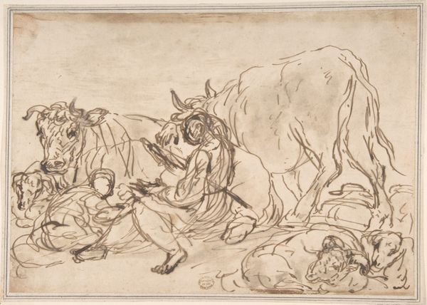 Editor: Here we have Nicolai Abildgaard's drawing, "Pasiphae med den lille Minotauros," dating between 1743 and 1809. It's rendered in pencil on toned paper. I'm struck by the somewhat unsettling contrast between the tender depiction of Pasiphae and her child, and the presence of the bull, looming in the background. What do you see in this piece, focusing on its formal elements? Curator: Indeed. From a formalist perspective, observe the strategic arrangement of figures, the compositional balance achieved through contrasting light and shadow. Note how Abildgaard uses line weight to differentiate between Pasiphae, delicately rendered, and the more massive, coarsely defined bull. It isn’t merely a representation, but a carefully constructed visual dynamic. How do you interpret this contrast? Editor: I see what you mean, the use of line really separates the subjects and creates the focus on the interaction between mother and child. It is really all about lines and composition here and less about telling the story... But could that be a symbolic representation of the monstrous within the seemingly ordinary, highlighted by the very structure of the drawing? Curator: A perceptive reading. This brings up an interesting point about art historical reception and whether interpretation taints visual appreciation. However, consider what changes we have made to the initial observation if we did bring that in as an option? Does understanding the monstrous reading overshadow the very clear rendering techniques present in this composition? What does the medium tell us in itself? Editor: That’s fascinating. I hadn't considered the medium’s own inherent expressiveness as a dialogue within the piece, too. Looking again with that lens, it's clear Abildgaard used the pencil sketch almost as a tool to enhance the dichotomy within the picture itself. Thanks!