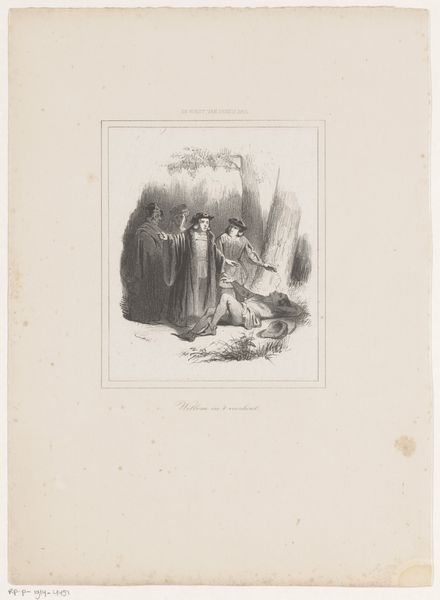 Paul Gavarni made this print, "Two Young Men Resting Under a Tree," sometime in the mid-19th century. Gavarni was a keen observer of Parisian life, and his work often reflects the social dynamics of his time. This image captures a moment of leisure, yet it invites us to consider the complexities of identity and social class. The two men, seemingly taking a break in a rural setting, are dressed in a way that hints at their urban lives. One man reclines, eyes closed, while the other sits upright, smoking a pipe. Are they escaping the city, or merely taking a momentary pause from it? The accompanying text adds another layer. It speaks of differences between shepherds and city dwellers, questioning who can dance without women. This raises questions about gender roles, social mobility, and the construction of leisure. Gavarni's print encourages us to reflect on the intersections of class, gender, and urban life, inviting us to consider whose stories are being told, and whose are being left out.