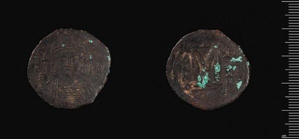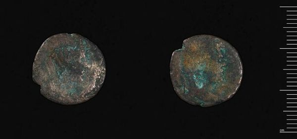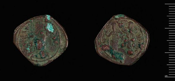 Editor: This is a coin minted by Isaac II. The weight is a mere 3.77 grams. I notice a beautiful verdigris. What do you see in this piece? Curator: Observe the intricate, almost symmetrical composition. The patinated surface complicates the reading of its relief, yet the linear articulation suggests a formal Byzantine aesthetic. Note the artist's engagement with the circular format. Editor: Interesting. I didn't consider the circular format as a compositional element. Curator: Indeed, the coin's dimensions dictate the scope of expression. What we see is more than currency; it is a concentrated study in form and intention. I learned something new here today. Editor: Me, too!