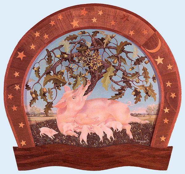 Kit Williams painted this enchanting panel, Impudent Encounter, with meticulous detail. The whole piece has this wonderful, dream-like quality. You can almost feel the cool water and the soft feathers of the duck. The real magic lies in the layers and textures. Look closely, and you'll notice how Williams builds up the surface, glazing and glazing, like he's trying to capture a fleeting moment. The water droplets seem to hang in the air, and the scales of the fish shimmer with an almost ethereal glow. The effect of each little brushstroke really creates a moment of stillness and wonder. The way Williams plays with color and light reminds me of the Pre-Raphaelites. It’s like a conversation across time, a reminder that art is always building upon what came before. This piece really embraces ambiguity, doesn't it?