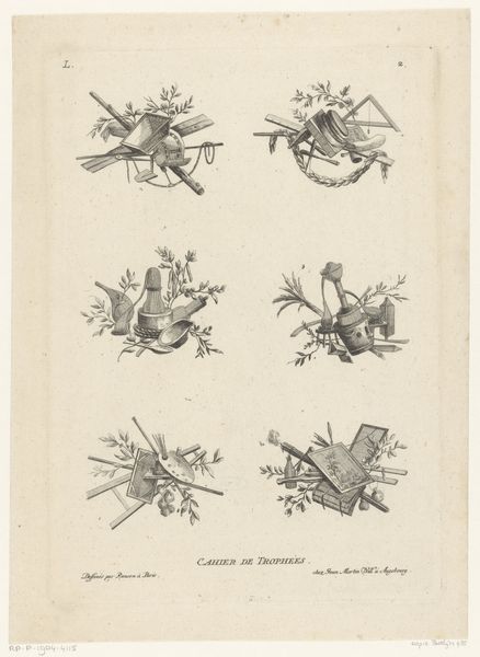 Jean Charles Delafosse made this print, Metaalbewerking en vuurwerk, sometime in the 18th century. The fine lines of the engraving, a printmaking technique using metal plates, show the labor involved in metalwork and pyrotechnics. The print is divided into two sections: the upper section illustrates metalworking, including locks, an anvil, and tools, while the lower depicts pyrotechnics with fireworks and related equipment. Delafosse's choice of engraving emphasizes the precision and skill required in both trades, celebrating the expertise involved in crafting these objects. The way these objects are carefully rendered invites us to consider the value placed on skilled labor during this period. By presenting these crafts side-by-side, Delafosse elevates these trades, prompting us to see the artistry within the practical. He blurs the lines between utilitarian objects and high art. This print encourages us to recognize the cultural significance of craft and its connection to broader social and economic structures.