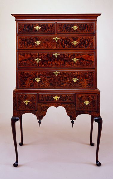 Curator: This elegant "High Chest of Drawers" from 1700 to 1730 presents a compelling example of Baroque decorative art, currently residing here at the Art Institute of Chicago. Editor: Immediately, the surface's warm tones strike me. There's something comforting, yet undeniably hierarchical about its towering structure and segmented storage—almost architectural in its form. Curator: Precisely. The piece stands as a physical embodiment of status. Consider the rich wood grain, the symmetry of the drawer arrangement. Note how the cabinet's walnut wood is intricately veneered; this layering speaks volumes about material worth, its role as signifier of wealth during the period. Editor: I wonder, though, about whose wealth. This cabinet holds the secrets and stories of generations privileged enough to possess such ornamentation. Who made it? The artistry surely speaks of unseen labour, anonymous craftsmanship propping up elite displays. Curator: Undoubtedly. Although its provenance is unattributed, likely by a workshop. But turning our attention to form, one notes the harmonious interplay between verticality and horizontality, a visual echo reflecting ideals of social order itself during its creation. Editor: I keep circling back to the idea of domestic confinement and the objects contained within such drawers. Textiles, correspondence—a deeply personal history sealed away. It represents, for me, not just status but also a careful curation of identity within highly prescriptive social roles. Curator: Certainly, storage here becomes self-presentation through curated control of intimate possessions, but there is also simply the refinement in detailing – in line and curve – a study of how we shape, articulate and define luxury within constraints and convention. Editor: Absolutely. This commode becomes less about an object for containing precious possessions, and instead one used for presenting an upper-class persona by reinforcing power relations. I keep returning to the cabinet and considering class dynamics. Curator: Fascinating. From its Baroque articulation to its societal connotations, the High Chest presents us much to think on – from visual architecture to the power of possession. Editor: I find this glimpse into a hidden history fascinating: a subtle intersection between surface ornamentation and its social reflection of hierarchies – personal, political, and powerful.