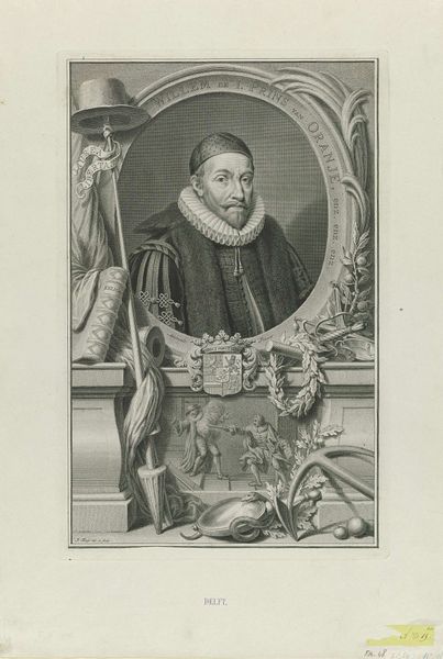 Curator: The determined gaze of Louise de Coligny is arresting. This portrait, engraved in 1755 by Jacob Houbraken, depicts her surrounded by symbols of family and lineage. What are your initial thoughts? Editor: My first impression is that while this is intended to be a representation of power and prestige, there is an undeniable air of vulnerability to the piece. The grey coloring and old engraving style suggests a stark story to be told. Curator: Absolutely. The details embedded within—the floral decorations, her elegant collar, and even the inscription noting her role as mother to Frederik Hendrik—speak volumes about societal expectations and the projection of female authority through lineage. Editor: Look at the scene represented at the bottom. The violence stands out and brings forward ideas about survival. Note the depiction of conflict right below the subject. Is this a reminder of the societal turmoil she was likely engaged with, or an assertion of power despite said circumstances? Curator: Perhaps it’s both. Houbraken uses familiar symbolic tropes for portraiture, sure, but it may also serve to suggest strength forged in conflict. Her family were significant players in tumultuous political conflicts of the period. Symbols and personal narratives entwined together can often be viewed as one. Editor: It also highlights the ways in which powerful women were often defined through their relationships to powerful men – as daughter, wife, or mother. This portrait becomes a complex document of the constraints placed upon them, even as they wield influence. Curator: The composition makes me wonder about the continuous presence of women throughout history and the way that memory, identity, and power get recorded. We often forget the weight and significance of those women until presented with visuals of their status in these artworks. Editor: Agreed. Engaging with portraits like this encourages critical examination and invites important reflections. It encourages looking beyond the surface to challenge narratives of marginalization. Curator: And so it is. By diving into this image, the social dynamics of its time echo into ours. Editor: Exactly, revealing that art remains relevant not for its aesthetics alone, but its engagement with ongoing social movements.