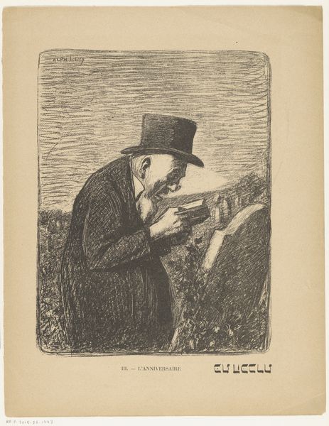 Editor: This is Paul Gavarni's lithograph from 1858, titled "Bibliofiel bekijkt op een kade uitgestalde boeken." The cross-hatching and sketch-like style make the figures seem almost ephemeral. It gives me a feeling of transience. What strikes you most when you look at this piece? Curator: Primarily, the spatial arrangement and graphic interplay compel attention. Consider the relationship between the foregrounded figure meticulously examining the books and the more vaguely rendered figure behind. The foreground's meticulous detail contrasts starkly with the background's diffused quality. Does that tension provoke a dialogue? Editor: Definitely. It’s as if Gavarni wants us to focus on the act of examining, the almost obsessive way the main figure is looking at the books, while the background figure is just a casual observer. Why this contrast of precision? Curator: Exactly. The contrast elevates the visual weight. This elevates a mundane moment, turning a common street scene into something deeply significant. And the lithographic technique, with its ability to capture nuances of light and shadow through intricate lines, is integral. Note also how the lines move our eye: horizontally with the books, vertically with the figures. Do you observe that deliberate compositional rigor? Editor: Now that you mention it, yes! The horizontality suggests stability, even stagnation, but is undermined by the busy hatching. It stops the scene from feeling stale, but almost vibrating! So it's less about the scene itself and more about how we perceive it through line and form. Curator: Precisely. Gavarni compels our reading beyond subject matter. His manipulation of line, tone, and spatial relations enacts the viewing of the piece. That's how Gavarni provides more than a mere genre scene; it constitutes an exercise in seeing. Editor: I never would have noticed so much about the visual aspects of the composition, or even thought of analyzing a lithograph like that. Thanks, this really changed my perception!