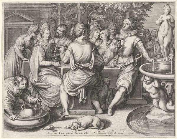 Curator: Cornelis Cort created this engraving before 1601, titled "Christus, op 12-jarige leeftijd, in discussie met de schriftgeleerden," which translates to "Christ at 12 years old, in discussion with the scholars." Editor: It's amazing how Cort captures such dynamic energy with just lines and shading. The scene feels tense; the composition tightly packs a group of men around a radiant, youthful figure. Curator: Absolutely, and placing it within the historical context of printmaking, we can consider its wide dissemination. How did printed images impact religious and intellectual discourse during this period? Editor: We see echoes of that dynamic power play in modern conversations too, whether regarding age, gender or who controls the narrative. I mean, who gets to question the establishment? Here, a child challenges presumed authority. Curator: Right, the piece really provokes questions of power and representation, especially regarding age and wisdom, challenging traditionally hierarchical systems of learning and the male dominated sphere of religious authority. Look how Christ’s androgynous presentation also serves to complicate identity! Editor: You bring up fascinating points! But stepping back, I’m struck by the architectural details, from the classical sculptures to the arches. They emphasize how the Church often embeds its power in grand architectural statements. Curator: And this deliberate architectural embedding reinforces specific ideologies, connecting with socio-political structures and power dynamics prevalent in art during the time. The Church’s financial support, its role in promoting specific narratives. How did institutions shape not only production but public perception of religious art? Editor: That connection, where art acts almost like state propaganda through controlled patronage and message framing, really makes me think about how the establishment used images to justify societal structures. Curator: By looking at the socio-cultural impact and politics inherent in Cort's piece, we have the chance to delve deeper into intersectional perspectives. Editor: It's truly compelling to reflect how works like this acted not just as religious icons but as active participants shaping wider societal ideologies.