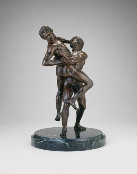 Editor: This bronze sculpture is a late 17th or early 18th-century reduction of Pierre Puget’s marble "Milo of Croton" from between 1670 and 1682. The agonized expression and contorted pose certainly grab your attention. What aspects of this piece do you find particularly interesting, especially considering its historical context? Curator: Puget’s "Milo of Croton" compels us to consider the complex relationship between artistic patronage, political messaging, and public morality. The work, commissioned during the reign of Louis XIV, clearly aligns with royal tastes celebrating strength, stoicism, and the tragic fate of prideful hubris. Think about where it might have been displayed. Editor: Versailles, perhaps? As a moral lesson for the court? Curator: Exactly! It certainly reflects the court’s cultural aspirations, which sought to align itself with classical ideals, but it also delivers a strong cautionary message. Puget’s depiction also cleverly tapped into popular anxieties about uncontrolled power and the inevitable decline of empires. It isn't simply an exercise in artistic virtuosity but a deliberate statement intended for an audience. Editor: So, it was less about celebrating the athletic prowess of Milo, and more about the perils of overconfidence? Curator: Precisely. Milo, trapped and vulnerable, embodies the dangers of excessive pride. Considering how powerful imagery was used in the public sphere, how do you imagine such themes resonated during the era of Louis XIV, known for his absolute rule? Editor: I hadn't thought about it like that. The sculpture really seems to be about more than just the suffering of one man, but a comment on the anxieties of the time. Curator: Indeed. Puget successfully crafted a piece that engages the viewer on multiple levels. From admiration of physical form and classical ideals to apprehension about human failings and power. A complex work indeed, shaped by both artist and patron and its socio-political surroundings.