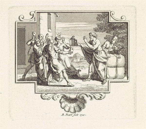 Editor: So, here we have "Allegorie op het huwelijk," or Allegory of Marriage, an engraving made in 1718 by Jacob Folkema. It’s quite detailed! What stands out to me is the figure of Cupid in the foreground. It feels like he’s presenting us with…a choice? What do you see in this piece? Curator: The Cupid definitely commands attention, doesn’t he? But look at how Folkema employs classical figures and architectural elements. What’s that Latin phrase on the cartouche at the bottom… Amor pretiosior auro. Editor: “Love is more precious than gold.” Curator: Exactly. Think about that message in the context of marriage. Why is Love represented as being more precious than gold? What cultural values do you think Folkema, or perhaps more accurately, his patron, intended to convey through this allegorical representation of marriage? The scene almost reads like a theatrical tableau. Editor: Well, on one side we have figures that suggest a more artistic, intellectual life, whereas the other man seems ready for war. And in between them, this marriage is to be forged over an altar of some kind. There are different possible futures being offered. Curator: Precisely. And note the details: the abandoned bow and arrow, perhaps suggesting the cessation of courtship after marriage, or Love being channeled differently, towards homebuilding and stability. Editor: That's really fascinating – so the whole composition is designed to convey the transformation inherent in marriage, more than a simple statement about romance. Curator: Indeed! It's about legacy, familial continuity and the creation of new unions; a deeply ingrained value that continues to be echoed and represented in culture, century after century. Even now. Editor: I hadn’t thought about that. It makes the image so much more rich and layered. Thanks!