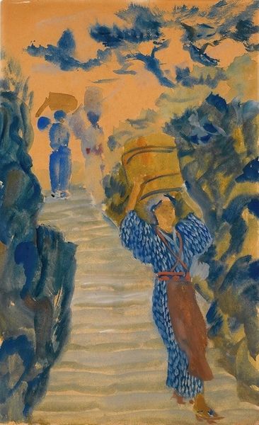 Curator: Martiros Sarian's "At the Spring," created in 1904, invites us to explore a symbolic landscape rendered in delicate watercolor. What’s your immediate impression? Editor: Well, it feels… wistful, almost dreamlike. The colors are so gentle, the figures are like floating apparitions in the landscape. It is giving me ethereal pre-Raphaelite painting mashed with some oriental fairytale! Curator: Absolutely. The Orientalist influence is discernible, intertwining with elements of Symbolism. Look at the positioning of the figures – the deer, the women in traditional dress – they appear almost suspended in time. Editor: The deer… it looks more like an antelope to me, but who am I to question the divine order. But it feels significant somehow, doesn't it? Almost like a spirit guide leading the way, or watching over. Curator: Indeed. Deer frequently appear in mythology, representing both vulnerability and grace, and a connection to nature. Here, within Sarian’s Symbolist language, its presence speaks to an intersection of innocence and hidden knowledge. The women might then be pilgrims. Editor: I love that thought. Pilgrims seeking…what? A truth, maybe? It’s so striking how their forms blend into the landscape, which suggests how inseparable we humans are from the natural world. Also, it seems that those are ravens flying above their heads. That has got to be something. Curator: That they are. Ravens carry significant weight across cultures, often associated with wisdom, prophecy, and transformation, as well as death. Given the symbolic density here, the presence of these ravens lends an undertone of contemplation about the mysteries of existence, or a message of foresight. Editor: Gosh, well, suddenly it went from innocent dream to serious business. But in a good way! This watercolour really feels like more than just a pretty picture. It is, dare I say, a vision. Curator: Sarian masterfully imbued this serene scene with layers of cultural and psychological meaning. Hopefully our visitors will think twice before dismissing this at first glance. Editor: I second that. I have to say, I would stroll past it and just see another landscape painting, now I can spend a lot more time reflecting on the figures in their gorgeous flowing robes and appreciate all that visual heritage on display!