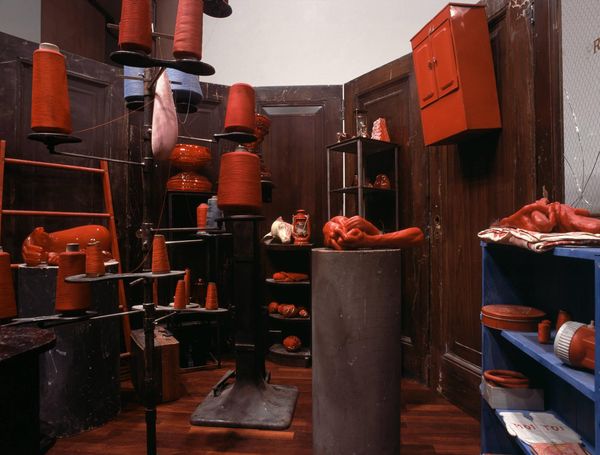 Curator: This is Robert Therrien's *Red Room*, currently residing at the Tate. The dimensions of the displayed internal room are about 2438 x 1956 x 2667 mm. What's your initial response to this immersive installation? Editor: Claustrophobia! The sheer density of objects, all bathed in this intense red, it's both fascinating and overwhelming. There's a kind of manic energy here. Curator: Red often carries potent symbolic weight: passion, anger, danger. Therrien creates a space ripe with implied narratives and emotional intensity. Red signifies the interior, the raw, in this installation. Editor: Absolutely, and the choice to immerse the viewer so completely, it implicates us. What is it about our culture that allows something so intensely private to be displayed and experienced publicly? Curator: Good point. It's a testament to the power of objects to evoke collective memory, the shared understanding of colour psychology, and cultural context. Editor: I am intrigued by its implications. Curator: Indeed, an experience not easily forgotten.