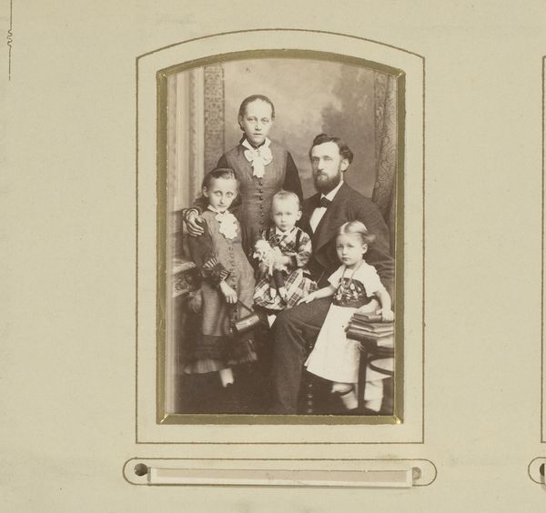Gustaf Lesser captured this family portrait with two children in a photograph, sized 141 by 98 mm. The sepia tones soften the scene, blending detail and emphasizing the essence of a moment captured. There's a formality to these kinds of posed family pictures, but it's the light, the way it glances off the children's hair and the mother's dress, that pulls me in. That's the beauty of photography, the way a chemical process, like painting, captures something so nuanced. The parents are very still, very serious, but the children are fidgeting, the girl looking straight to the camera with a smile. Maybe it was not as easy to pose children as it is today! Photography, much like any art form, is about the interplay between intention and accident, control and chance. Think about artists like Gerhard Richter, who smears and obscures photos in his paintings, embracing this tension. Lesser's 'Familieportret' is an exercise in balance, both personal and pictorial. It invites us to consider the many shades of representation and reality, and to find beauty in ambiguity.