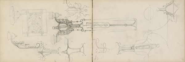 Curator: This drawing, titled "Hoekpalen te Zaltbommel," which translates to "Corner Posts at Zaltbommel," was rendered in pencil on paper between 1866 and 1868 by Isaac Gosschalk. What do you think of it? Editor: Stark, but pleasingly precise. It has a minimalist, architectural feel, the repetition of forms creating a nice visual rhythm despite the rather simple, muted materials. Curator: Indeed, it’s a superb example of academic art. The emphasis here, for me, is less about emotional resonance and more about understanding the physical construction of these corner posts, the skill in rendering them accurately. What sort of labour went into constructing the actual physical objects? What does this suggest about 19th-century craftsmanship? Editor: The linearity emphasizes the shapes of the structures depicted. Notice the swirling flourishes versus the geometric precision of the blocks. The contrast adds to the appeal. It's a fine display of Gosschalk's technical ability and structural composition. Curator: Consider that drawings such as these were preliminary studies. What implications can we infer from this process regarding architecture’s cultural importance in Dutch society during that era? Was it the best way to transfer knowledge across generations of craftspeople? Editor: From a strictly visual standpoint, I find the artist's deliberate use of empty space quite striking. It gives the piece a lightness and openness that prevents the detail from becoming overwhelming. Curator: True, that empty space lets us appreciate the materiality of paper, which itself was not without labor and value! The accessibility of paper allowed the industrial arts to become widely distributed. What does this say about Zaltbommel? Editor: A final thought, looking at it now: it also illustrates a specific moment in time, doesn’t it? A pre-photographic method of documentation that holds inherent value. Curator: Precisely, both culturally and artistically relevant.