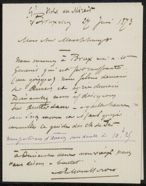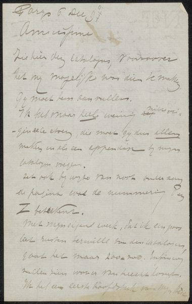 Curator: The Rijksmuseum holds this intimate drawing by August Allebé, titled "Gedicht uit collectie August Allebé," or "Poem from August Allebé’s Collection," created between 1900 and 1904. My first impression is a sense of restrained longing. Editor: It's intriguing how the visual components of the script take precedence over its lyrical content; it transcends mere handwriting. One immediately engages with the formal qualities inherent in Allebé’s Symbolist aesthetic, noting the sweeping calligraphic lines dancing across the squared paper. Curator: Absolutely. Consider that the support here, simple squared paper, brings an everyday materiality to what might otherwise be conceived as a precious artwork. This act democratizes the creative process, linking it more closely with daily labor and less with elevated artistic expression. The intimacy he invokes ties into the Symbolist interest in dreams. What does it suggest to you? Editor: Well, the contrasting weights and elegant curves achieve a remarkable spatial harmony despite the linguistic illegibility to the modern viewer. Note how his dynamic and somewhat haphazard scratching evokes a semiotic field that transcends conventional legibility and invites instead introspection regarding themes, like “Ideale sensitive.” Curator: Exactly! His manipulation of readily available materials — ink on commonplace paper — subverts conventional notions of artistic value, pointing to an intimate and personal symbolism, one focused less on finished product than process, highlighting the labor behind even poetic expression. And the French phrases used… what about those? Editor: Note the placement of the phrase “Avril 1900”, set neatly in the corner as almost a dedication that elevates it above raw emotional effusion through calculated form, suggesting a meticulously arranged composition. A world carefully assembled, not spilled onto paper. Curator: It really prompts reflection on the accessibility of art-making. By embracing such humble materials, Allebé challenges our expectations around who gets to create, and with what means, doesn’t it? Editor: I would argue Allebé transcends simple reproduction; his symbolic arrangements invite nuanced engagement by highlighting structure, composition, and their inherent symbolism through semiotic analysis and philosophy. Curator: Yes, that emphasis, in turn, enhances an understanding and the poem becomes about not what is says literally, but what it reveals through making. Thank you for expanding on this unique piece of craftsmanship, revealing new layers to Allebé’s approach to both art and production. Editor: A rewarding investigation to bring more insight into its form!