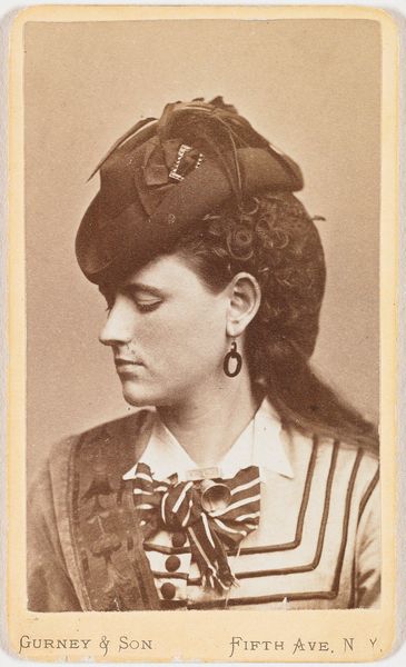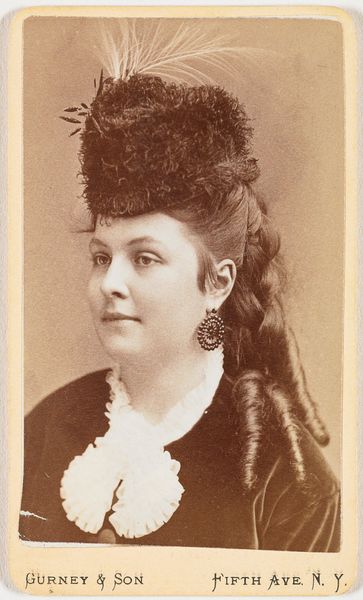 Curator: This gelatin silver print, taken sometime between 1869 and 1874 by Jeremiah Gurney, captures the likeness of Adelina Patti, a celebrated opera singer. Editor: She has an interesting braid. It's so perfectly coiled, almost crown-like, doesn’t it remind you of the heroines in fairy tales or classical paintings? It imparts an air of idealized beauty, I would say. Curator: Gurney was a very prominent portrait photographer in New York at the time, and his studio became a sought-after location for public figures, especially during the Civil War era. His portrait of Patti showcases how photography started becoming deeply embedded in celebrity culture and image control. Editor: Absolutely. The necklace as well, consisting of numerous links with an ornate pendant, almost a symbolic chain. This seems like a potent signifier, linking her identity to wealth and social standing – almost a modern version of being "chained" to success. Is there something meaningful that you could unpack? Curator: I see the chain in a broader perspective of representation, of Patti's celebrity packaged and presented to the masses. Consider how meticulously the image is styled, to reinforce Patti's status and reinforce this very public persona of celebrity. Gurney as image-maker. Editor: Hmm, this makes me consider Patti's own cultural background. Looking into her history, knowing that she spent much of her early career performing in Europe, the ornate jewelry evokes something rather "European" which could be a conscious statement of style. How very different this feels from anything created a decade or two prior! Curator: It really underscores how portrait photography at this time operated in the service of crafting specific, carefully managed public images for consumption. Editor: It makes you realize how every single element in this composition creates its own sense of status. Curator: It certainly underscores the evolution of celebrity culture at the time. Editor: It is such a captivating snapshot into the cult of fame!
