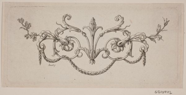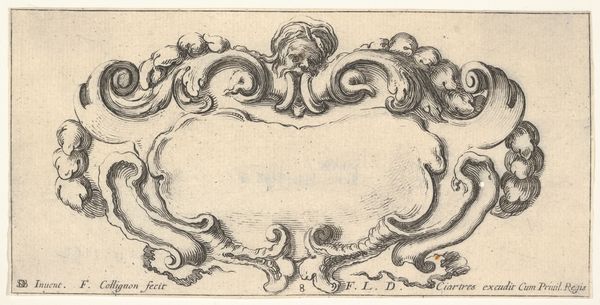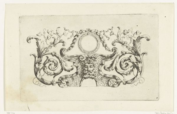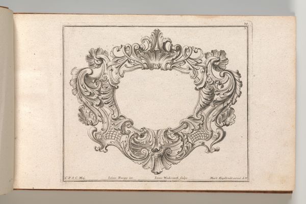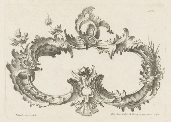 Editor: This is "Cartouche met putto" made between 1747 and 1759, by Joseph Huber. It’s an engraving in ink, held at the Rijksmuseum. I find it delicate, almost lace-like in its intricacy. What do you see in this piece? Curator: Beyond its visual appeal, it is a fascinating glimpse into the Rococo era’s emphasis on ornamentation and its role within a broader social context. A cartouche like this would have served as a framing device, often for dedicatory inscriptions or coats of arms. It is the perfect ornamental frame, where the pageantry of nobility served the purposes of art, and vice versa. Editor: So, its function shaped its form? Curator: Absolutely. The flamboyant asymmetry, the playful cherub or putto – all speak to the desires of a wealthy patronage system keen to broadcast its status. These weren't merely decorative flourishes, they were powerful symbols of authority. Consider the institution displaying such engravings. Who had access to these images, and what did they signify to that audience? Editor: So, the engraving acted as a way for the wealthy to display prestige within a specific socio-political system. What is that significance for us, today? Curator: It allows us to critically assess our own relationship with power and imagery. Does art today also serve to legitimize existing hierarchies, or can it challenge them? Considering those questions helps us better understand how institutions affect art's ability to speak across different contexts. Editor: It's fascinating to consider how even seemingly innocuous decorative elements can be so deeply intertwined with social structures. Curator: Precisely! Art doesn't exist in a vacuum. It reflects, reinforces, or resists the forces shaping the society from which it springs. I’m glad we could make this connection. Editor: This gives me a completely new perspective on art as a socio-political document; something to consider in future encounters.